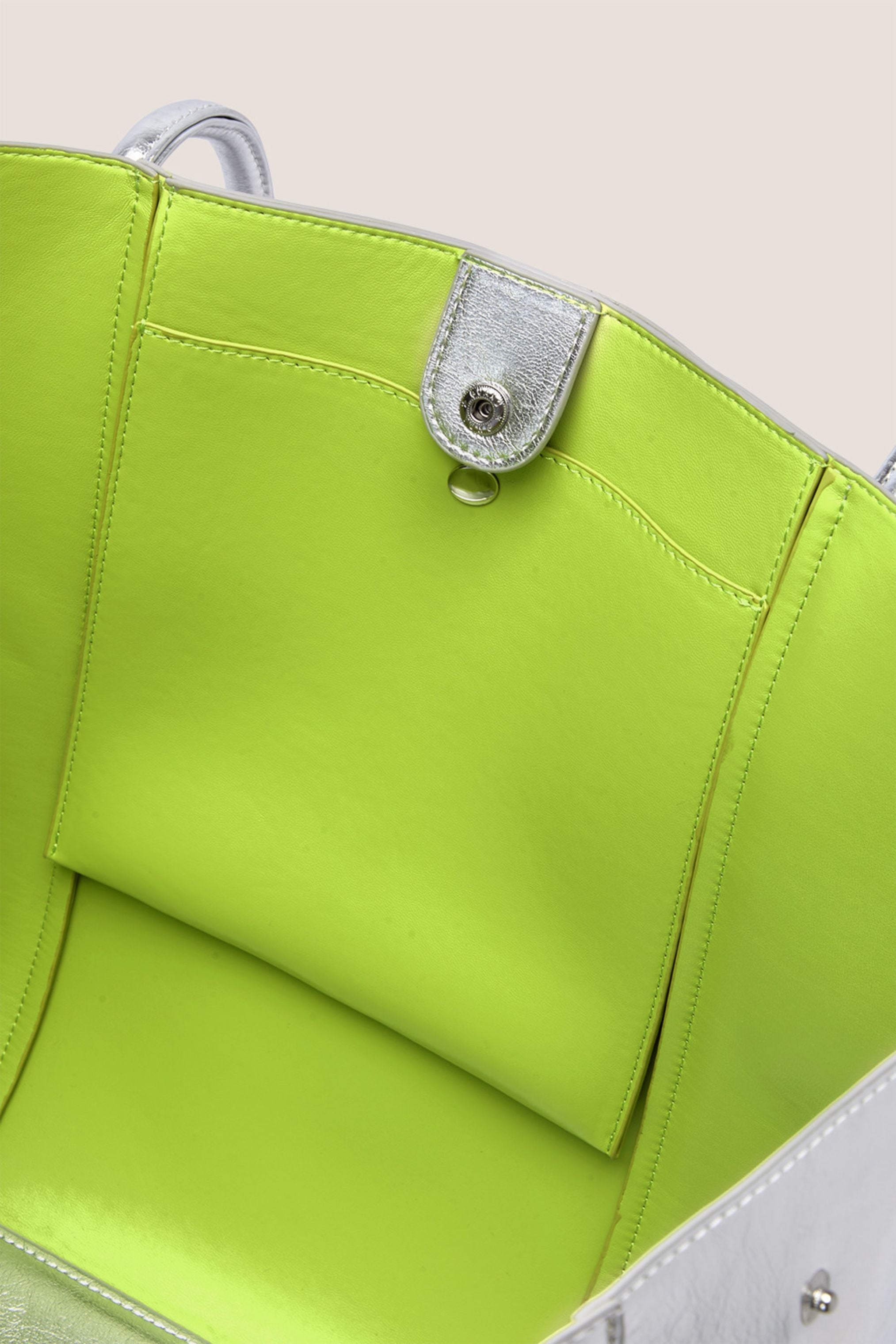 • Silver metallic vegan leather outside