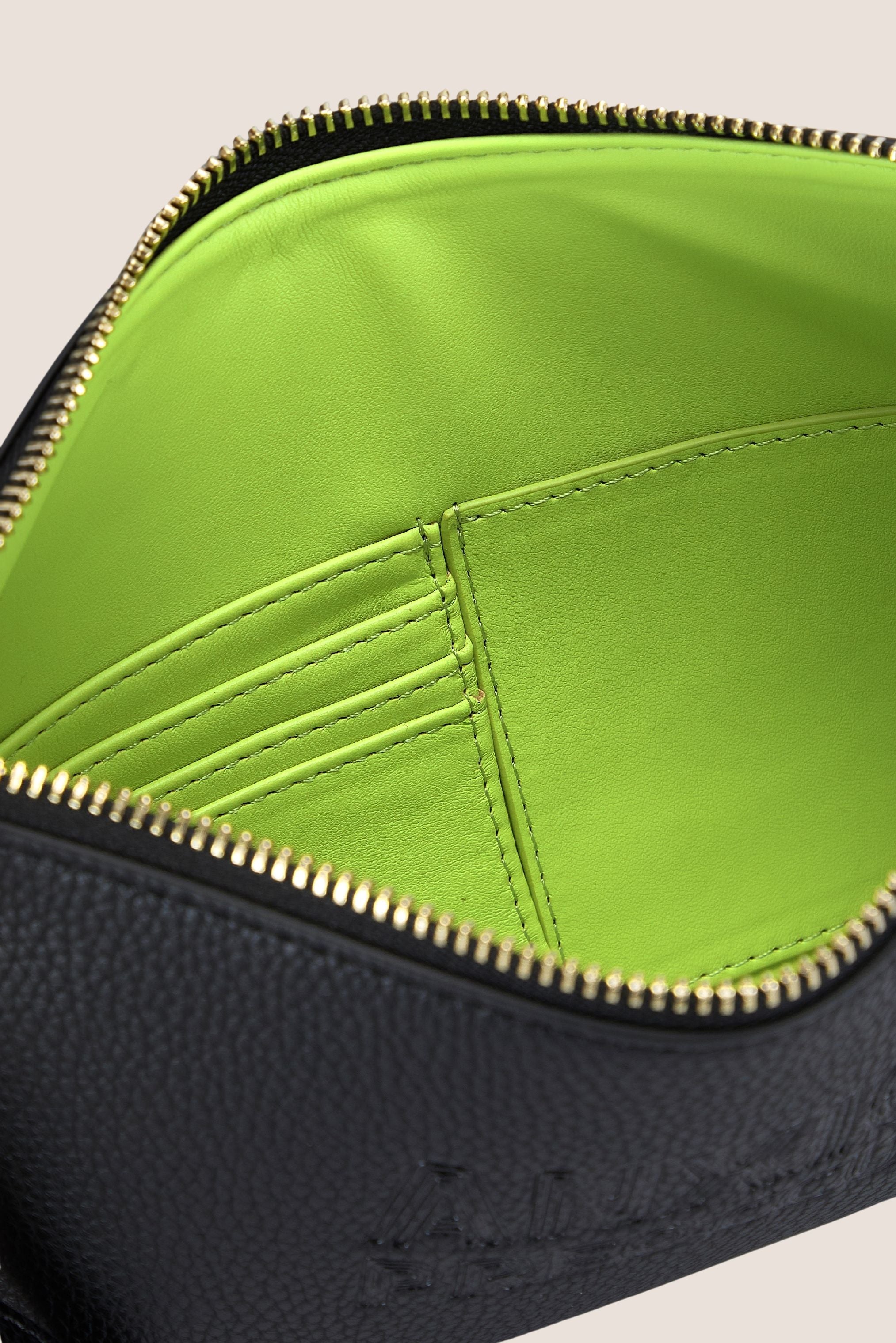 • Lined with lime green vegan leather inside